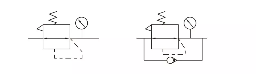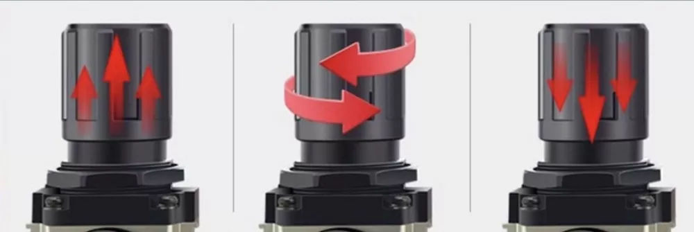 يوجد مقياس ضغط على غطاء التعديل. عند إمداد الهواء، اسحب المقبض لأعلى وأدره في اتجاه عقارب الساعة باتجاه علامة "+" لزيادة الضغط. بعد الضبط، اضغط على المقبض لأسفل لقفله.
