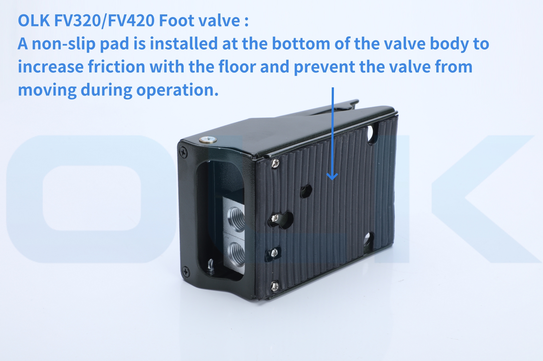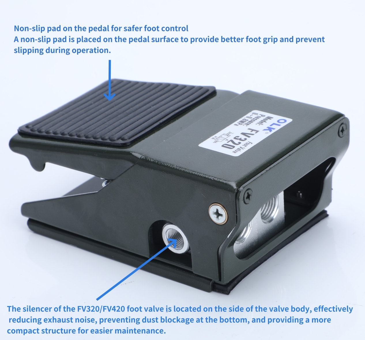 يستخدم موظفو الورشة أقدامهم بسهولة أكبر لأن وسادات القدم المضادة للانزلاق المصممة من OLK تزيد من الاحتكاك والمتانة. ويضمن صمام البدال FV420 عمر خدمة طويل.