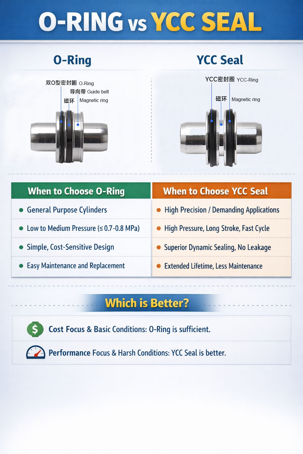 بالمقارنة مع الحلقات الدائرية التقليدية، يوفر مانع التسرب YCC إحكامًا ديناميكيًا أفضل ومقاومة التآكل، مما يسمح للأسطوانة بالحفاظ على أداء موثوق به في ظل تغيرات الضغط والدورات المتكررة. وهذا يقلل بشكل كبير من التسرب المبكر ويطيل فترات الصيانة.