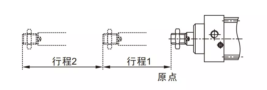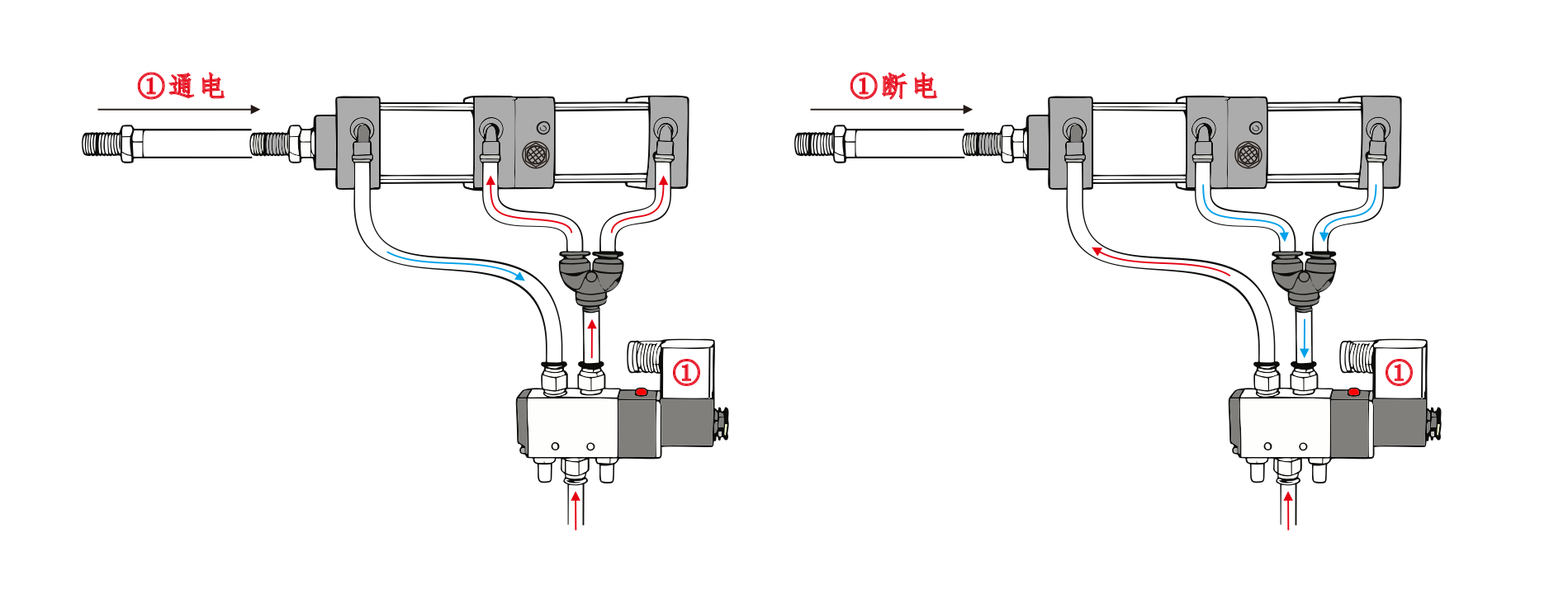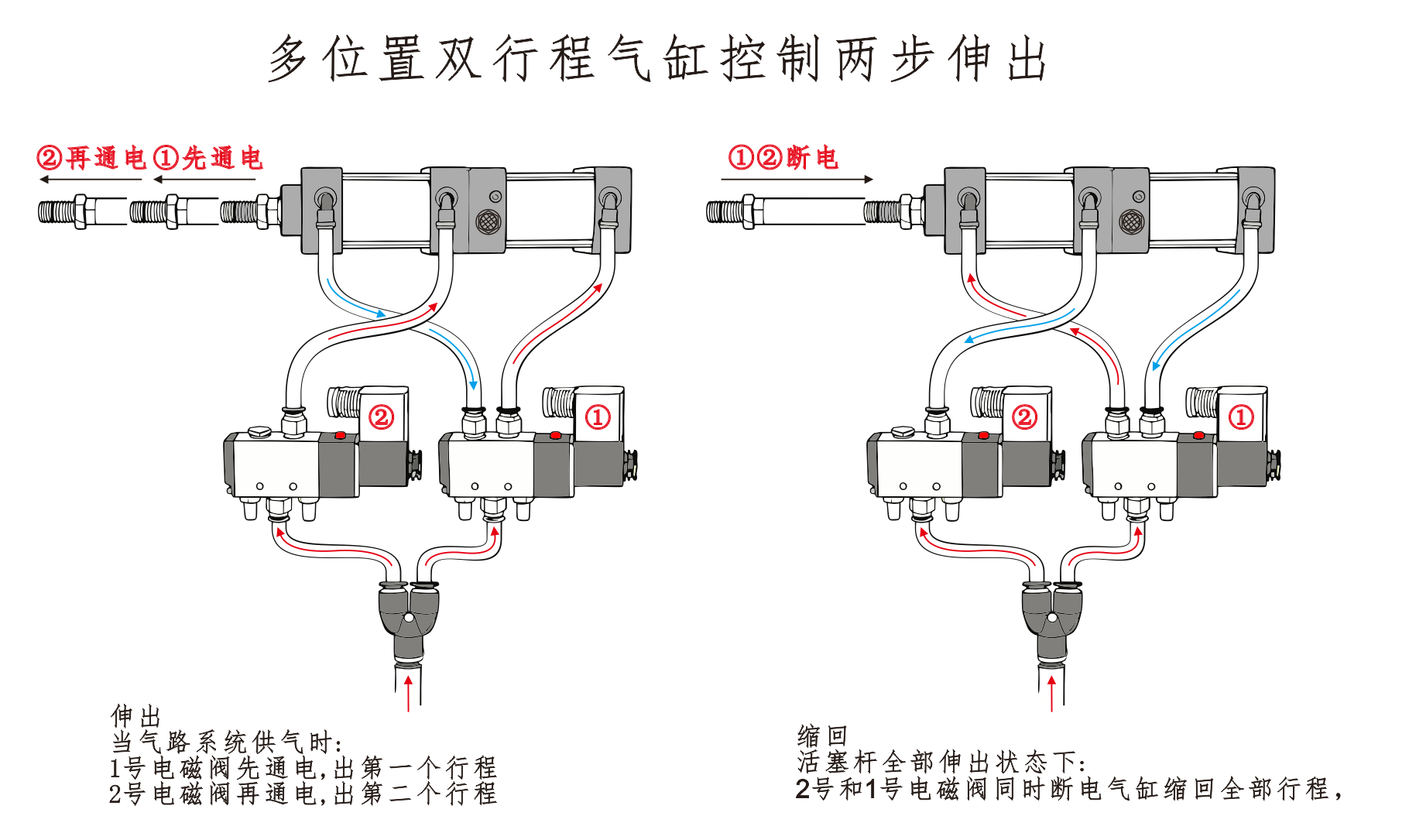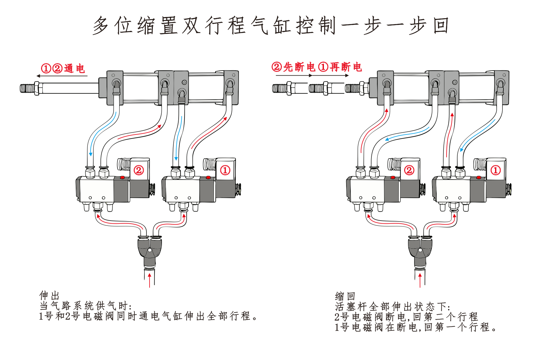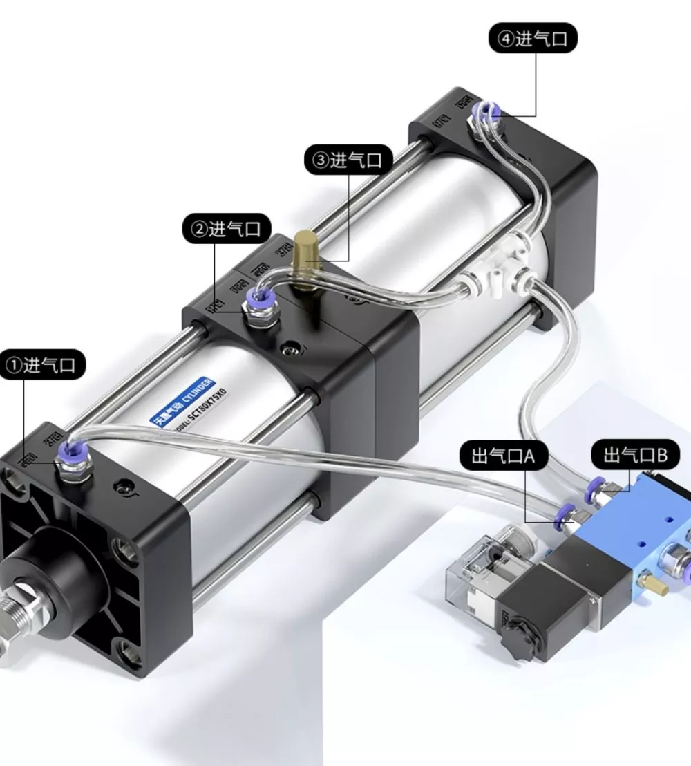 يتم توصيل مدخل الهواء للأسطوانة① بالمنفذ A لصمام الملف اللولبي، ويتم توصيل مدخل الهواء للأسطوانة④ على التوالي بالمنفذ B لصمام الملف اللولبي. مدخل الهواء للأسطوانة③متصل بكاتم الصوت. عندما يتم تنشيط المنفذ A من صمام الملف اللولبي، تبقى الأسطوانات في وضع التراجع. عندما يتم تنشيط المنفذ B، تبدأ الأسطوانات في العمل.